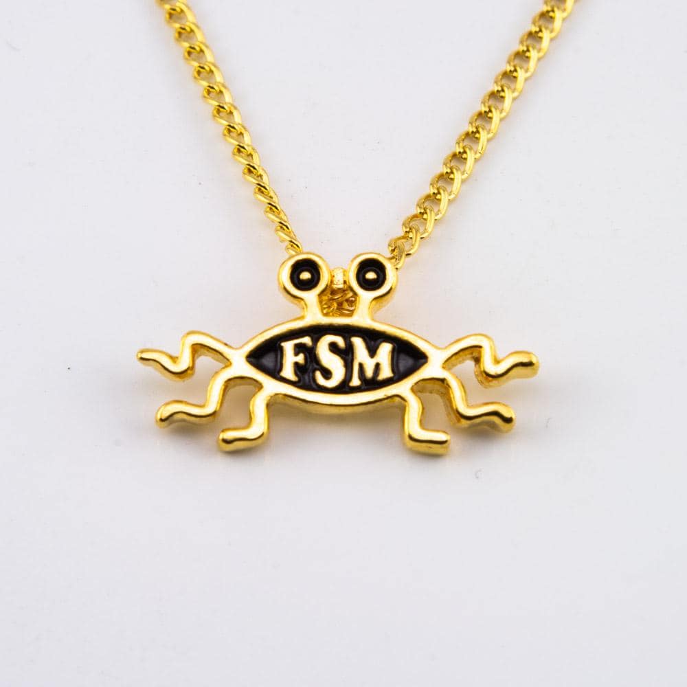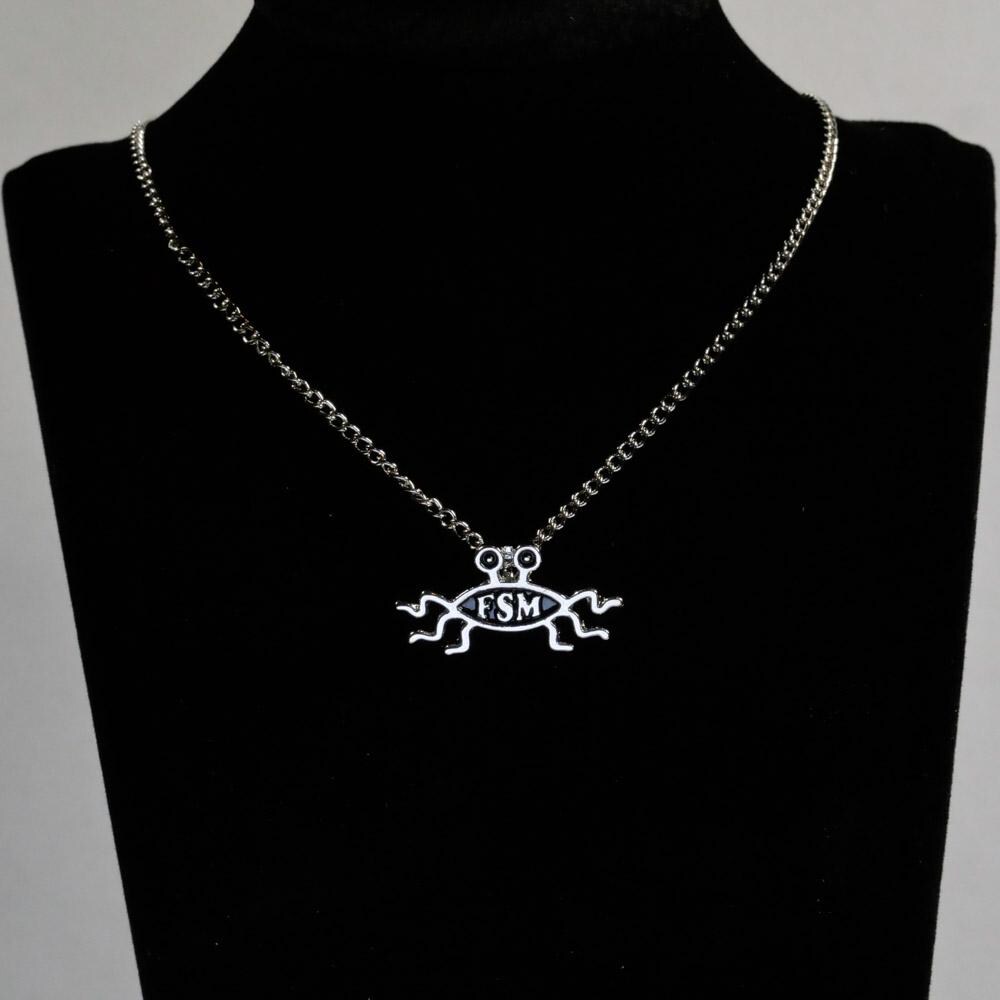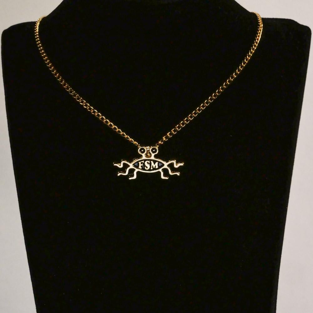 Our bright "Shapely" Flying Spaghetti Monster Necklaces make great gifts for Pastafarians who like to dress up a bit! Solid cast metal. Two sizes/colors available: 1" wide in gold finish and 1.5" wide in silver finish, includes 20" chain, and comes in a small gift/display box.