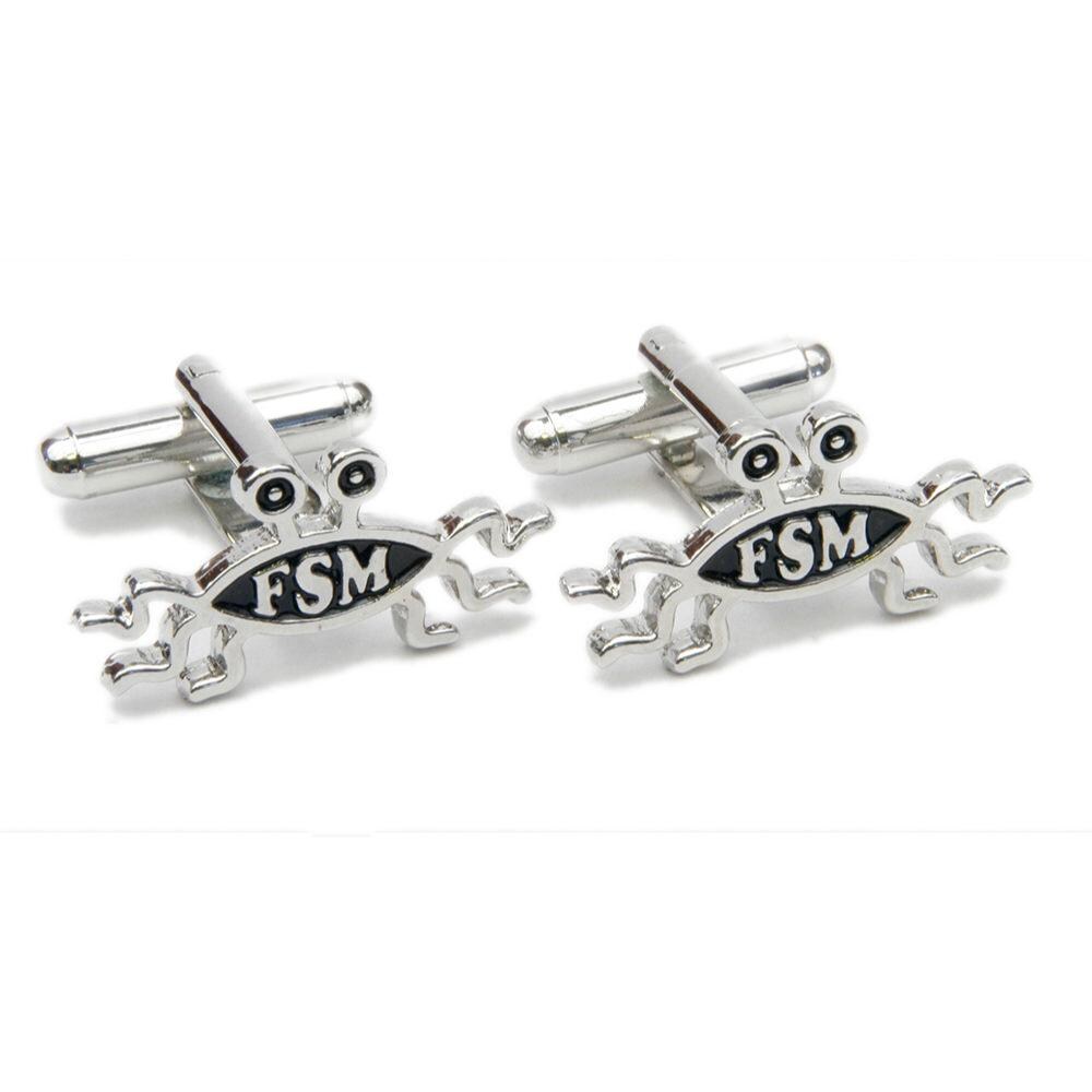 Our Silver-Finish FSM Cufflinks make a great gift for your Pastafarian friends! Pair of solid cast metal cufflinks, silver plating finish with black enamel inlay. In protective plastic display box. Design is 1" (25.4mm) long.