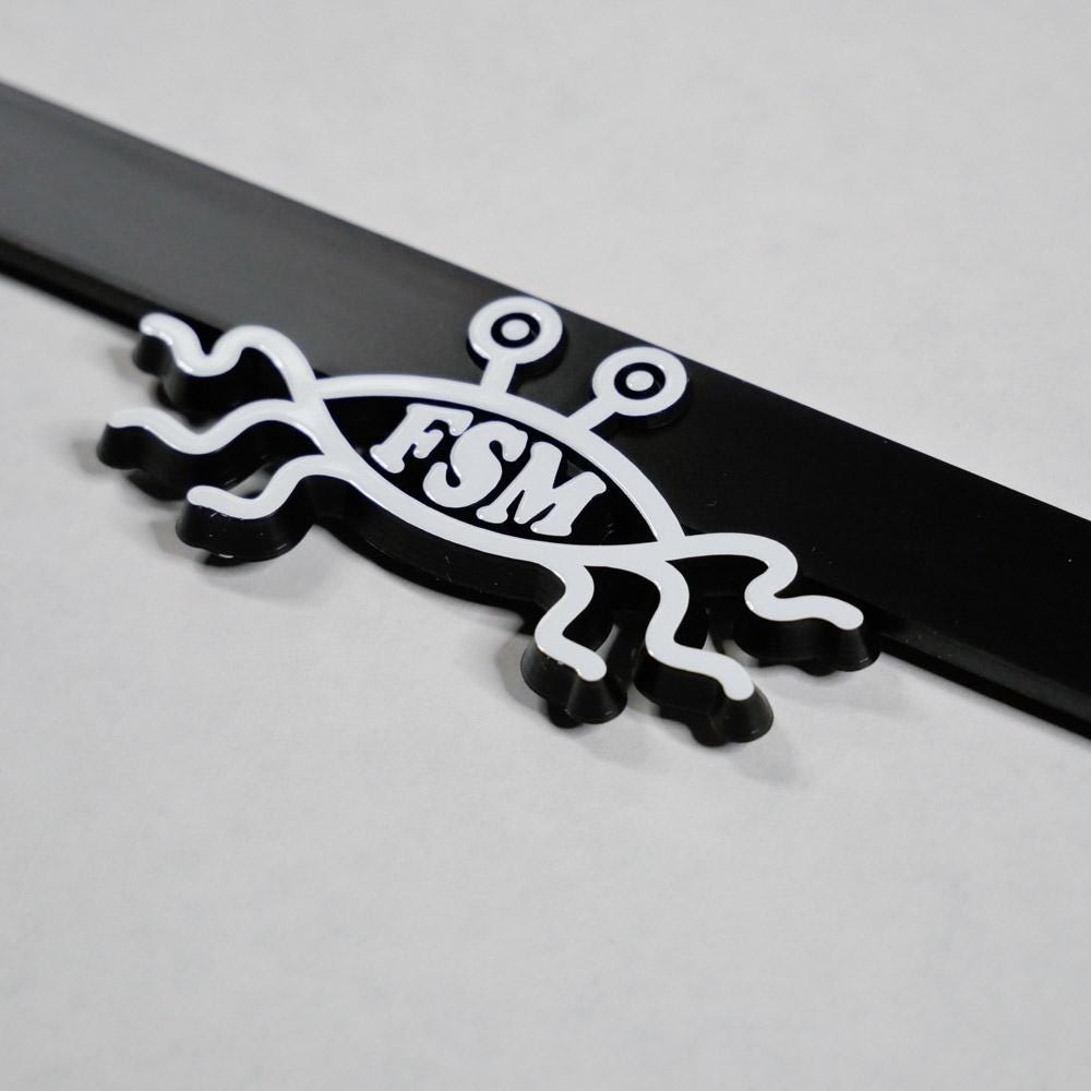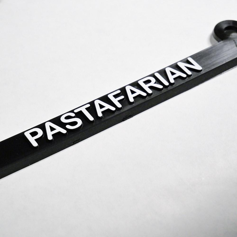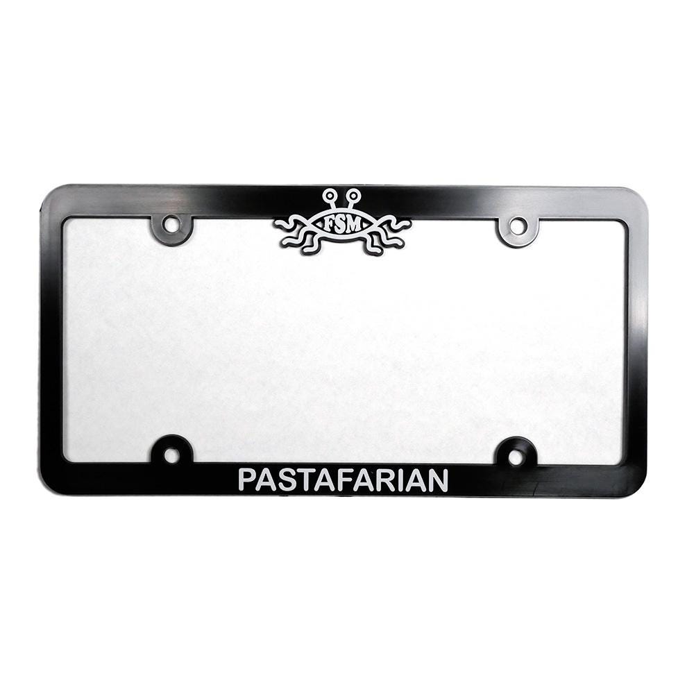 This molded black plastic license plate frame features a raised white FSM logo and bold "Pastafarian" text along the bottom, ensuring visibility and durability. Designed to fit standard U.S. license plates, it’s easy to install and built to withstand the elements.