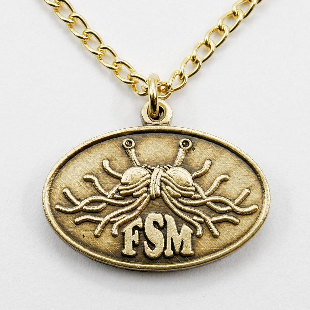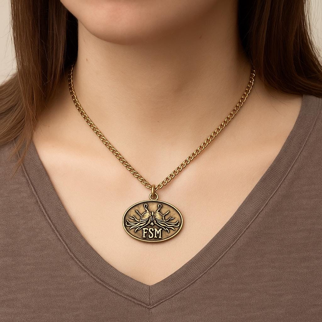 Our Antique finished Oval Flying Spaghetti Monster Pendants make great gifts for Pastafarians who like to dress up a bit! Solid cast metal. 1" wide, 1/8" thick. Includes protective gift box. Ships from California.