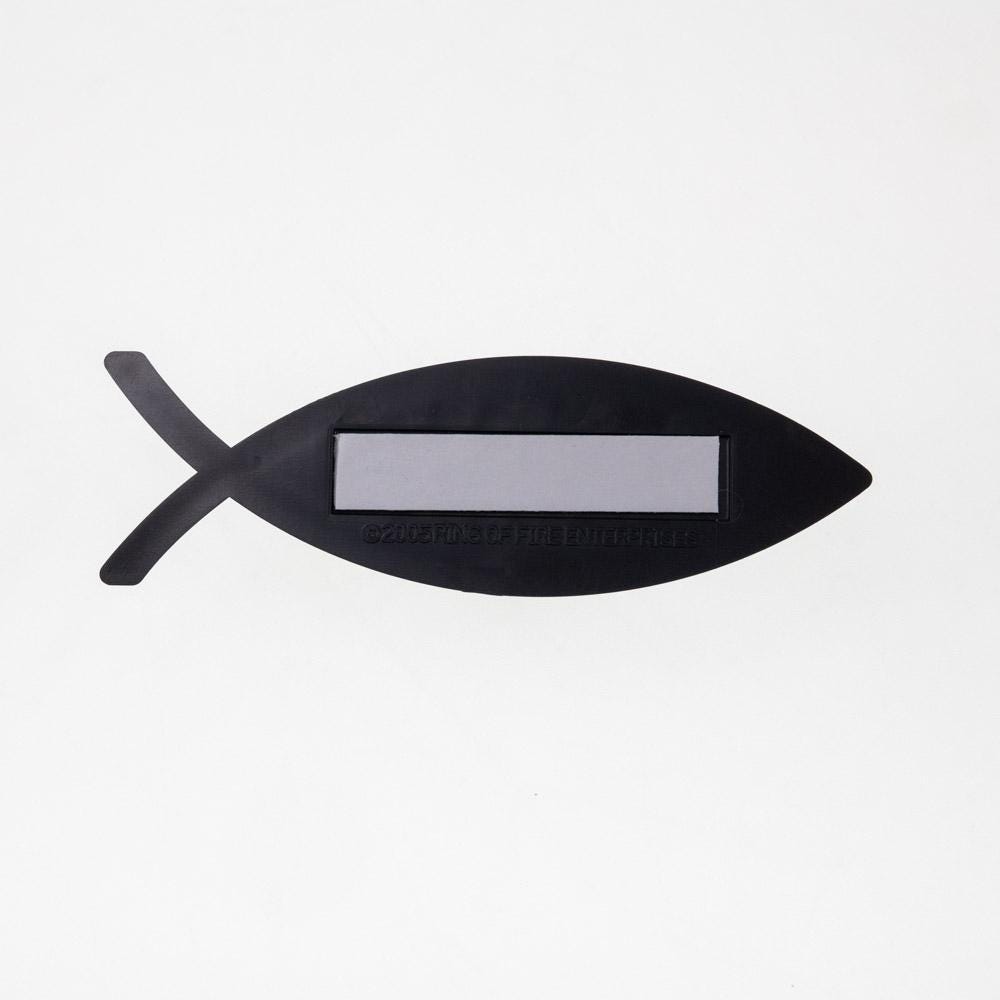 A Ring of Fire Enterprises Original. Molded black plastic, shiny silver-chrome front surface, adhesive pad on back. 5in long. Designed and manufactured in the USA.