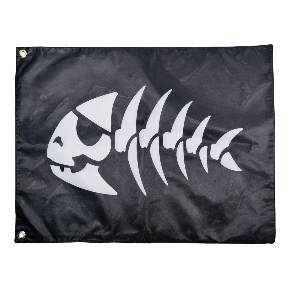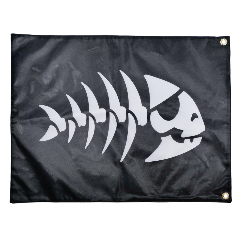 Our medium-size Premium Pastafarianism Jolly Pirate Fish Flag is 24" (61 cm) x 18" (46 cm) double layer, two-sided nylon with grommets. Ships from California. Not P.O.D.
