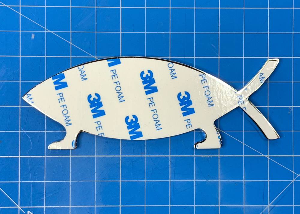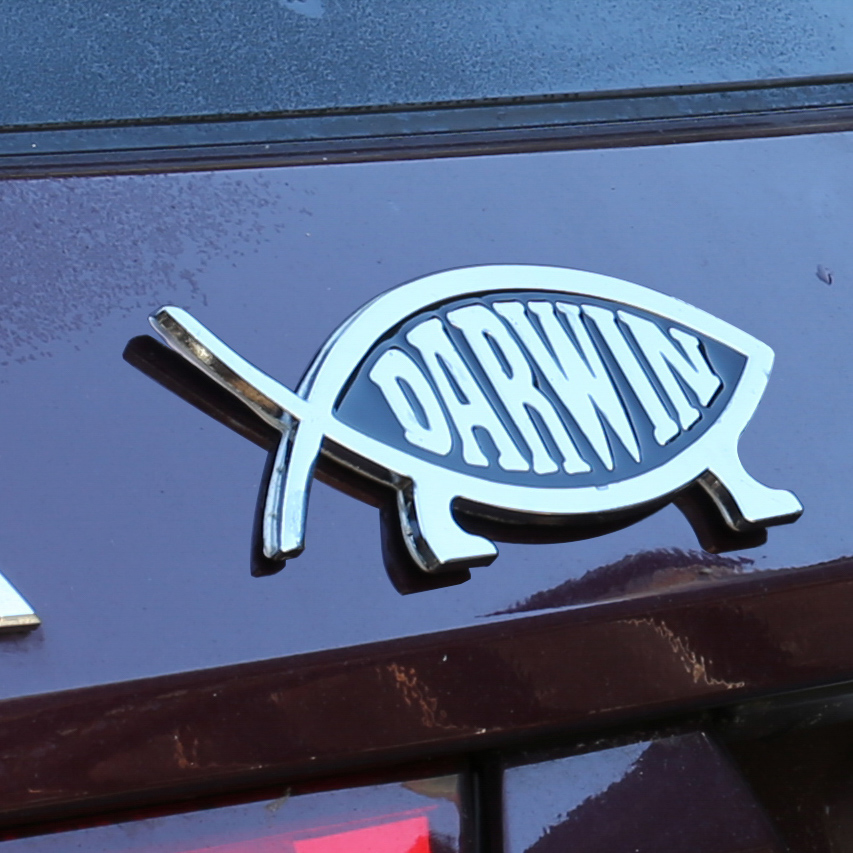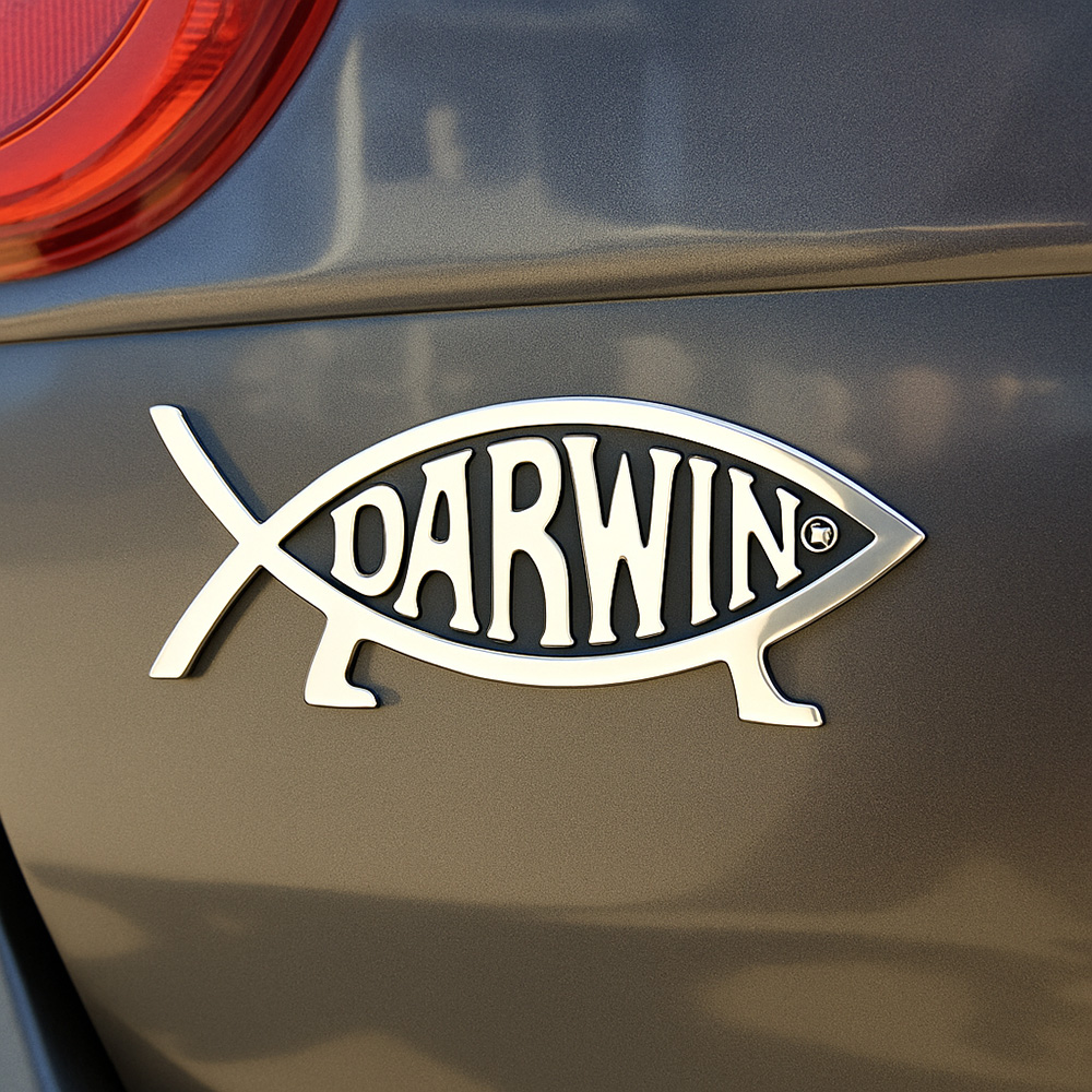 Our all metal Darwin Fish stick-on 3D Car Emblem makes a great gift for creationism contrarians! 5.25 in (13 cm) long, full coverage die-cut adhesive-back. Emblem, Solid Metal, No Plastic! Designed in the USA. Ships from California.